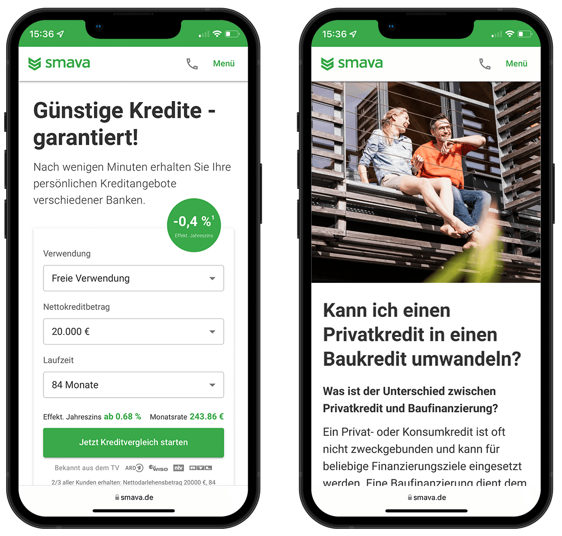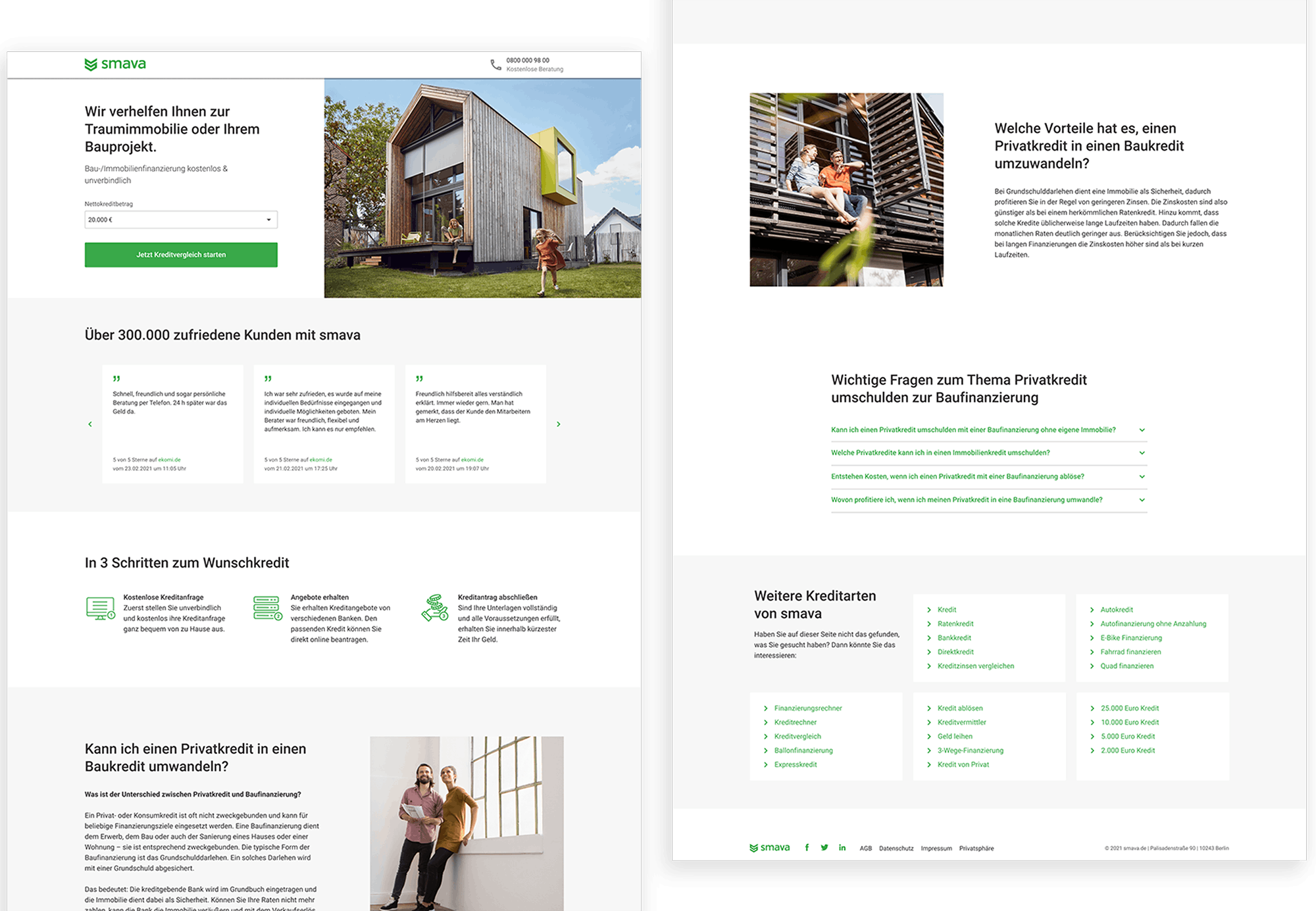 smava is not only a comparison platform for consumer loans. There are various offers from mortgage to vehicle financing to debt rescheduling. The right loan offers at low interest rates, free of charge and without obligation, with the highest level of data security.